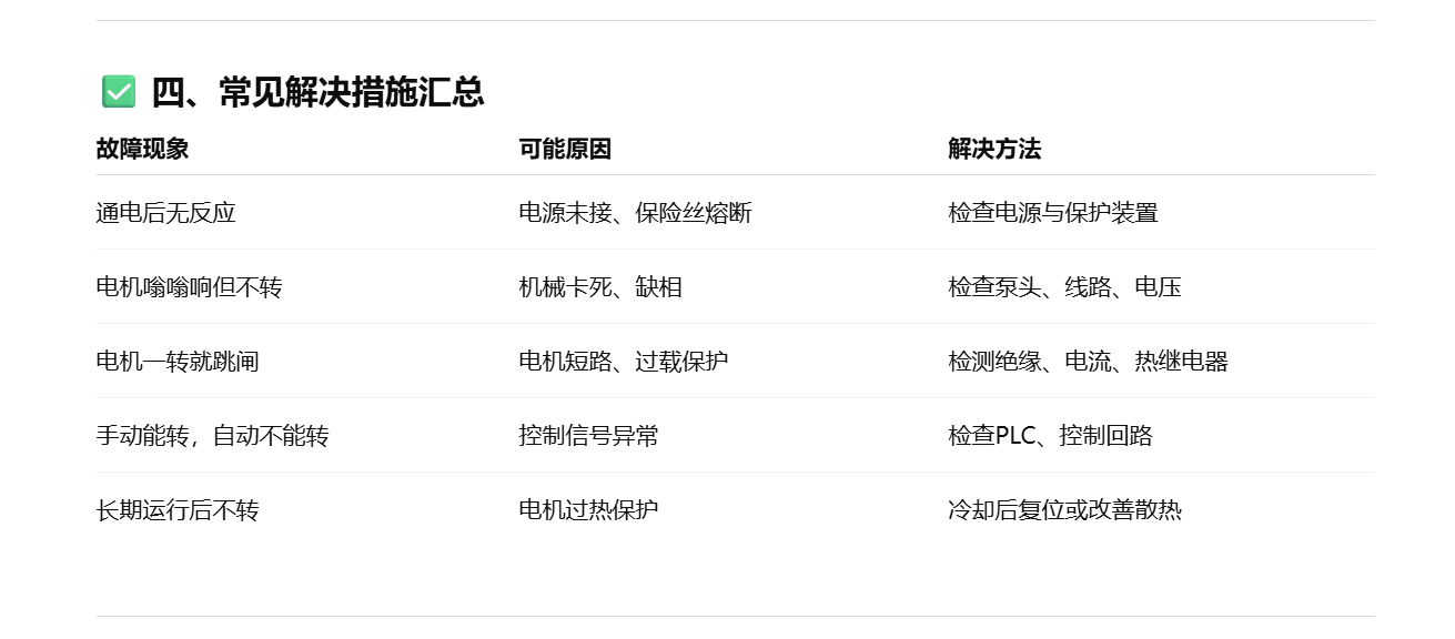 - 原因:电源开关未开启、保险丝熔断、线路断路、电压过低或缺相。
