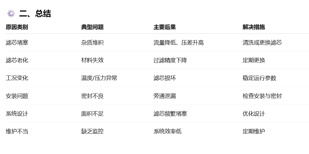 • 原因:过滤介质表面积累过多杂质、颗粒或油污,造成流通面积减少。